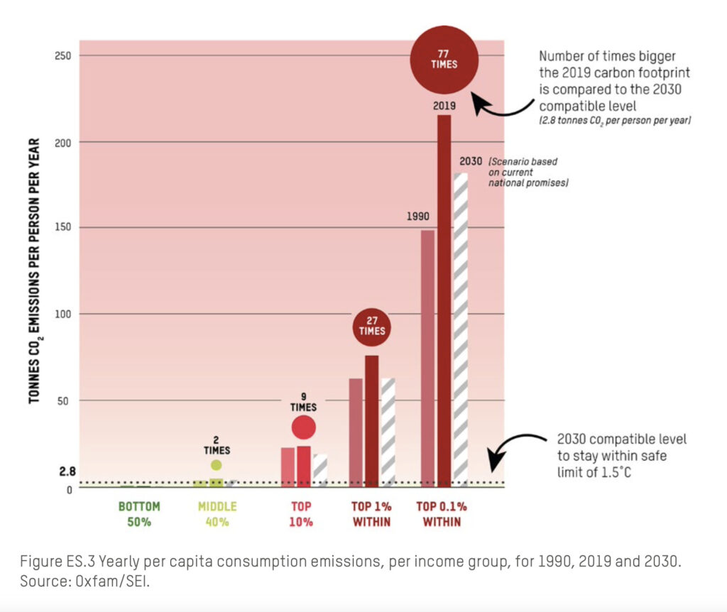 The new investigation by Oxfam – called The Great Carbon Divide – assesses the causes and implications of carbon inequalities as well as the disproportionate impact of the mega-rich, termed “the polluter elite”. This group is made up of 77 million people (who make over $140,000 a year), who accounted for 16% of all carbon emissions in 2019.